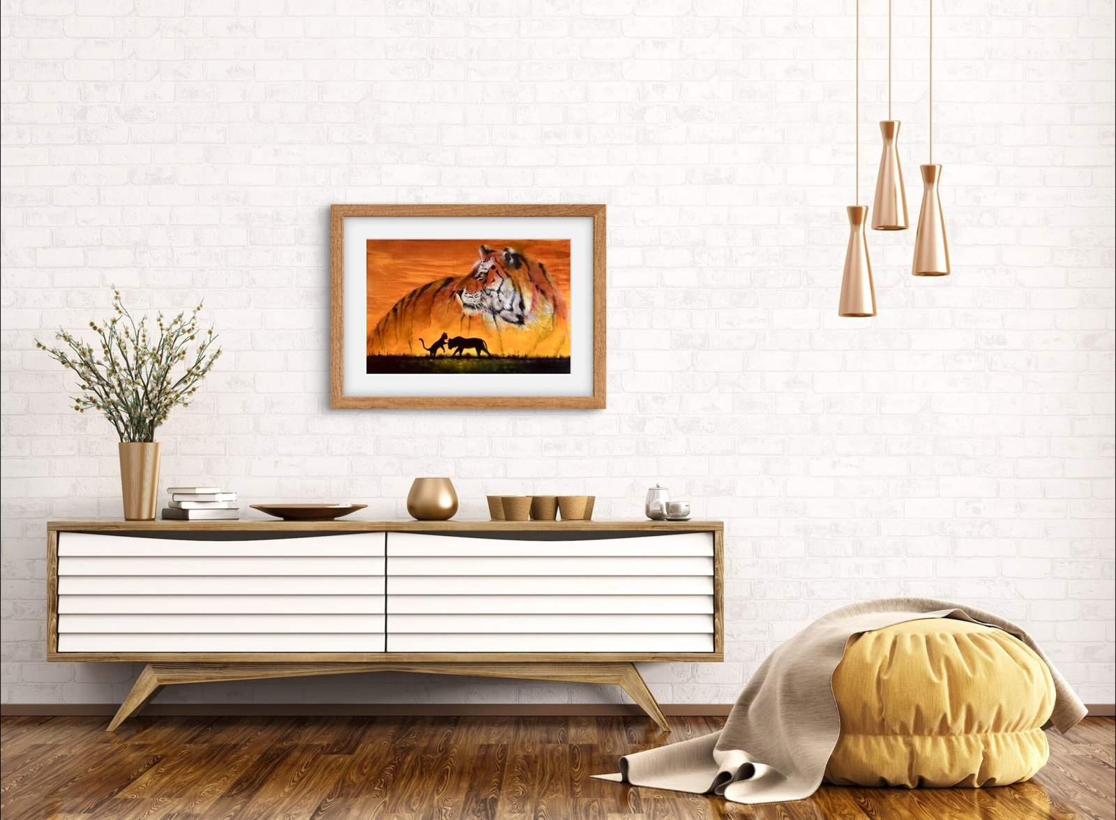 Motherhood is an acrylic on canvas painting that depicts the bond between a tiger and her cub set in the African plains. It showcases the strong, protective presence of the mother tiger and her playful cub.