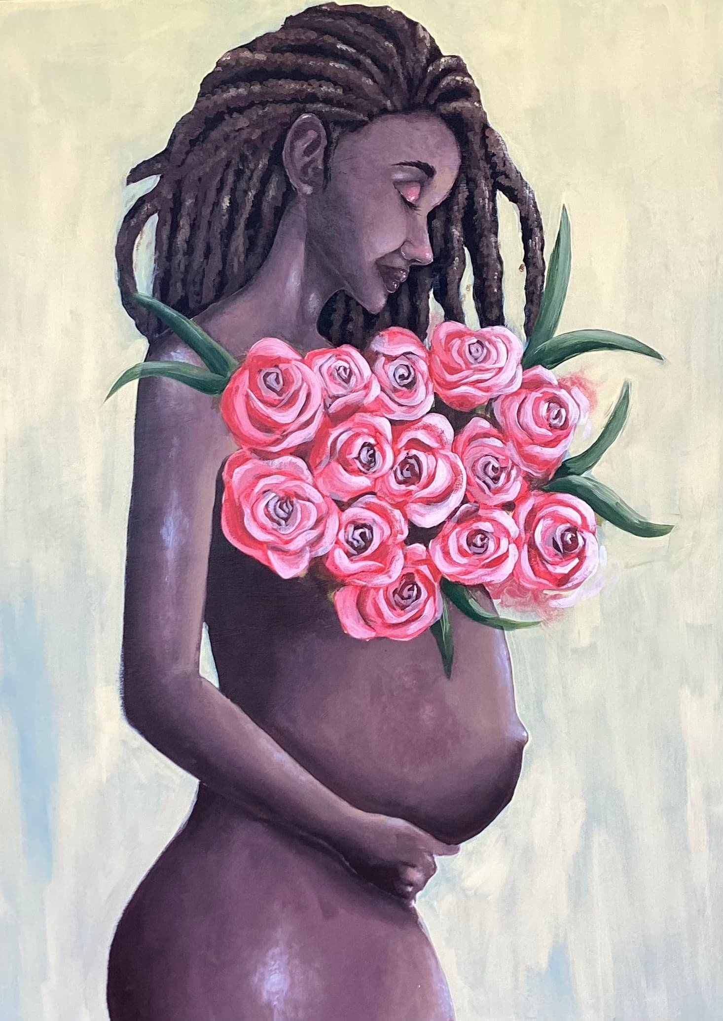 “Prolepsis” is an invocation of tomorrow. The pregnant woman, portrayed in profile, embodies continuity and grace. Her form is dignified, her gaze unseen, yet her presence commands reflection. Across her chest, pink and red roses bloom in gentle defiance, shields of softness, symbols of love, maternal power, and the complex beauty of creation. Each petal whispers of tenderness and fortitude, rendering vulnerability not as weakness, but as a sacred threshold. This is not a portrait of a single woman, but of every woman who has ever carried a future within her. In “Prolepsis”, gestation becomes a metaphor for vision. It honors the body as prophecy, the feminine as force, and motherhood as a sovereign act of duty.