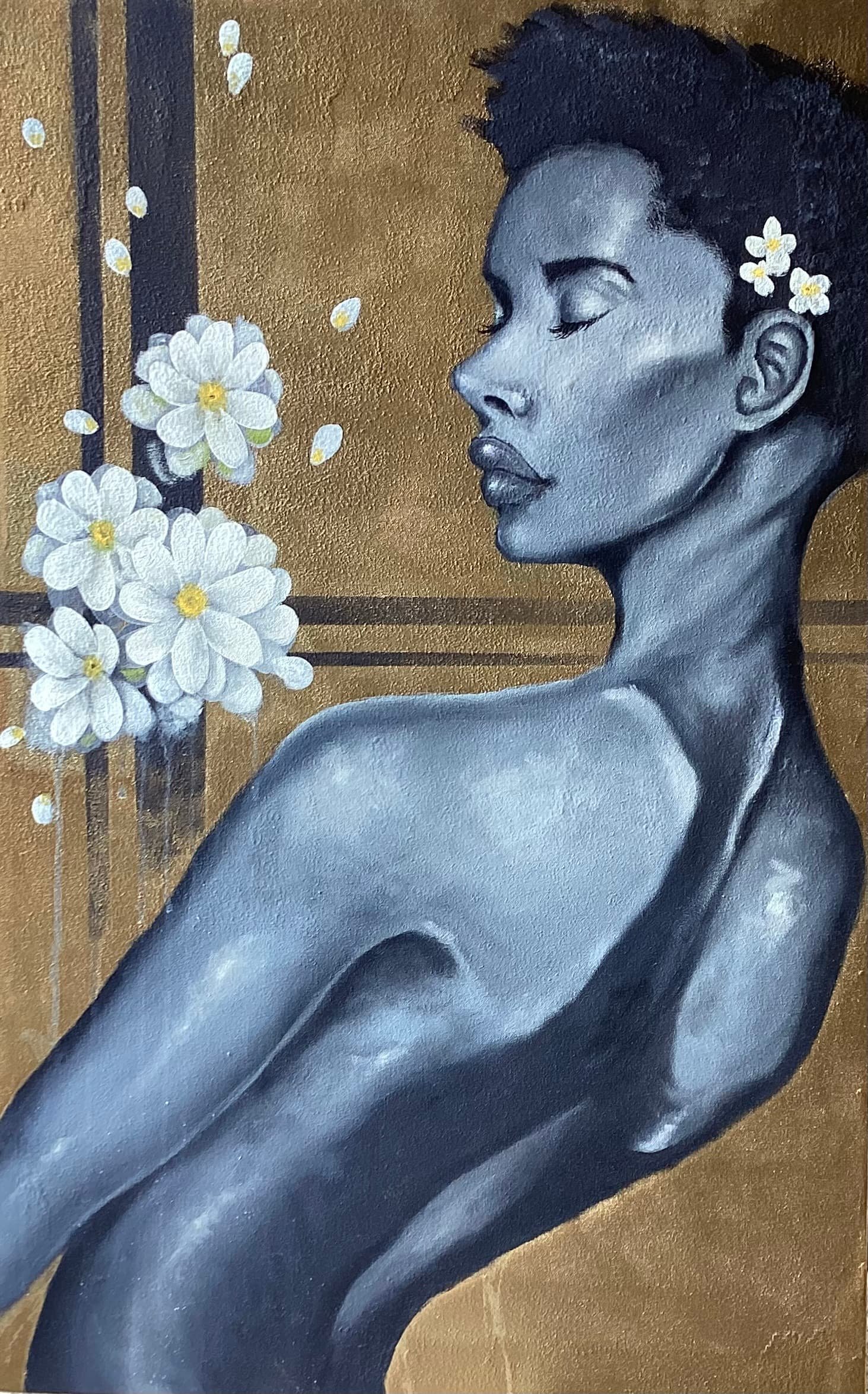 “The Grandeur” captures a sense of quiet majesty through its portrayal of a figure with her back turned, suggesting a sense of grace and poise that does not require approval. The artwork features intersecting black lines that form a cross, drawing attention to a central point where four delicate white flowers are placed, adding softness and welcoming a new beginning. They serve as a reminder that beauty can flourish in carefully defined spaces. This piece emphasizes that true grandeur is not about flashy displays but rather the strength found in restraint and the elegance of simplicity.