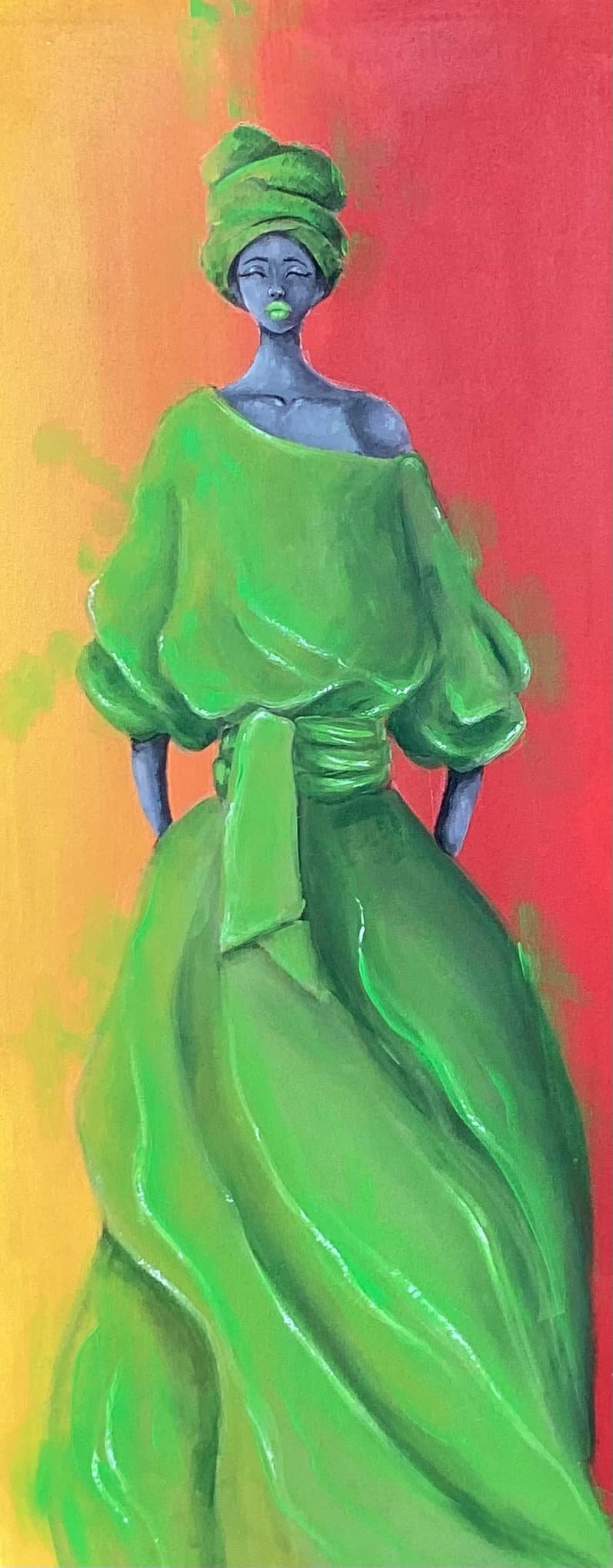 “Verdure” stands at the intersection of identity, heritage, and quiet resilience. A woman emerges, cloaked in rich green, a visual meditation on rootedness. Her presence is calm, her posture assured, as if absorbing the layered energy of the red and yellow backdrop behind her. Each shade mirrors a facet of the Grenadian flag, a constellation of national essence, the wisdom of generations, and the memory of sacrifice. Her green dress anchors her as the breath of nature, the pulse of tradition, and the poised strength of identity informed by the past but not defined by it.